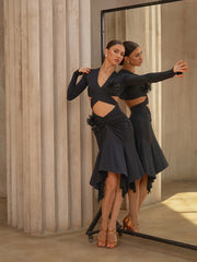 The front crossover design frames the neckline with elegance, while refined pleats at the waist smooth the line for a flawless fit. An asymmetrical hem sways with every move, and the hand-crafted floral accents add the final touch of artistry and allure.