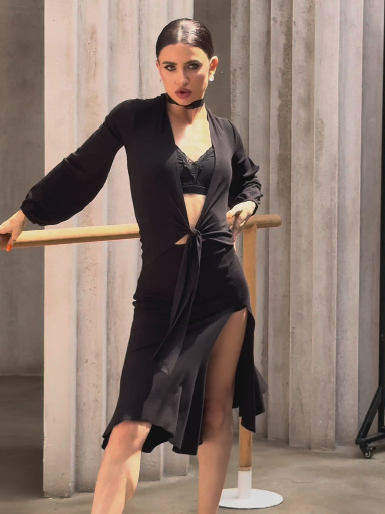 Tie Dress moves gracefully, and it carries a richness and elegance that lingers in every detail. The relaxed sleeves flow gently around the arms, giving a subtle sense of movement. A delicate loop at the front waist adds charm, while the open-back cut softly reveals sculpted curves.