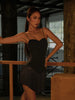 The triangular cut doesn’t just force a longer line—it follows your curves, shaping and lifting with clean, graceful arcs. 30cm of dense fringe amplifies every step, catching light and motion for pure drama. A delicate metal logo accents the waist, adding refined detail to this exceptionally versatile design.