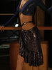 Adorned with a circle of beads and sequins that wraps around the waist and hips, it adds a playful shimmer with every move. The one-piece wrap design allows you to define your perfect fit, while the metallic logo offers a refined touch. The ruffled hemline sways naturally, creating a timeless, dynamic look with every step.