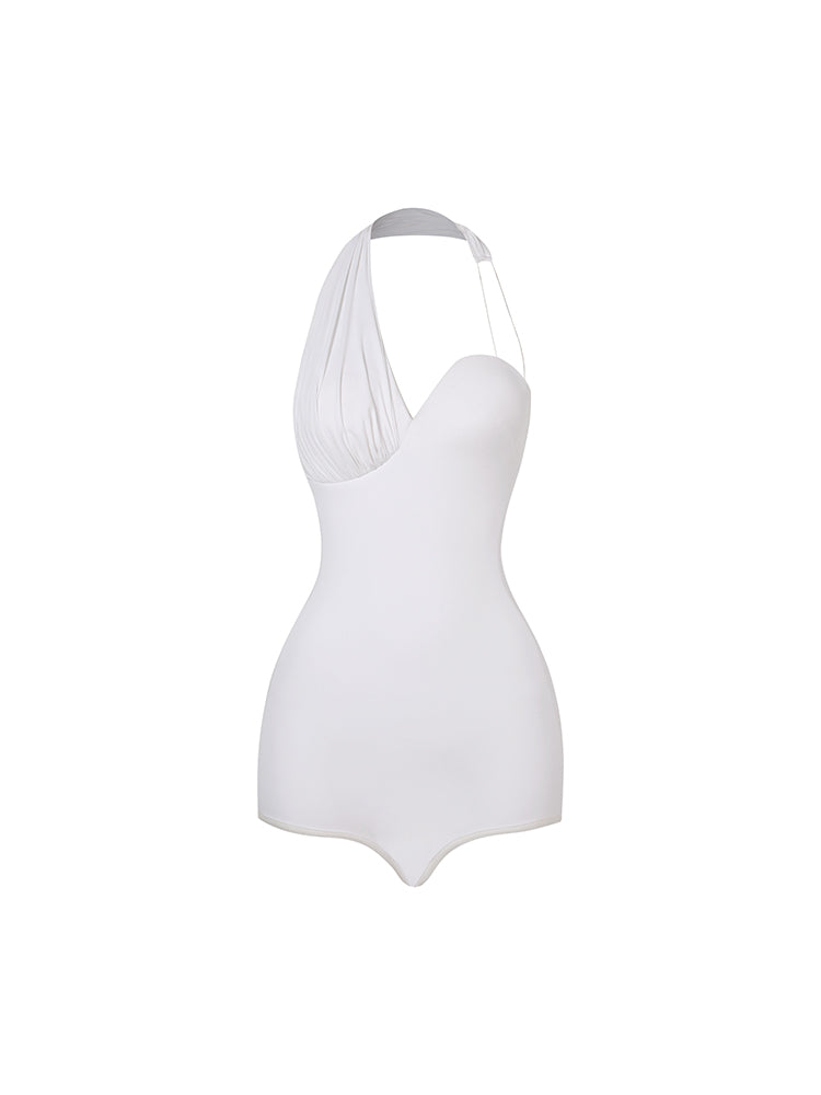 Bold asymmetric cuts blend with clear elastic bands from just below the left collarbone to the bust, creating subtle shaping and eye-catching detail. The deep open back with a fixed halter neckline reveals striking shoulder and back lines, while the fitted silhouette enhances your best angles for confident moves.